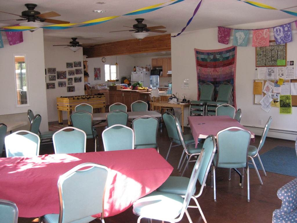 In 2005, after many years of planning, the original common house building was torn down and a new common house was built. The current common house consists of a four bedroom-two bathroom apartment upstairs and the downstairs includes the community’s dining room (sitting 50 for dinner and 70-80 for concerts), a large kitchen, a TV/meeting room, a bathroom and a shared laundry room. In addition, a two room-1 bathroom wheelchair accessible suite was added to the front of the common house with a nice big porch. A new patio and eating area were constructed in the back.
